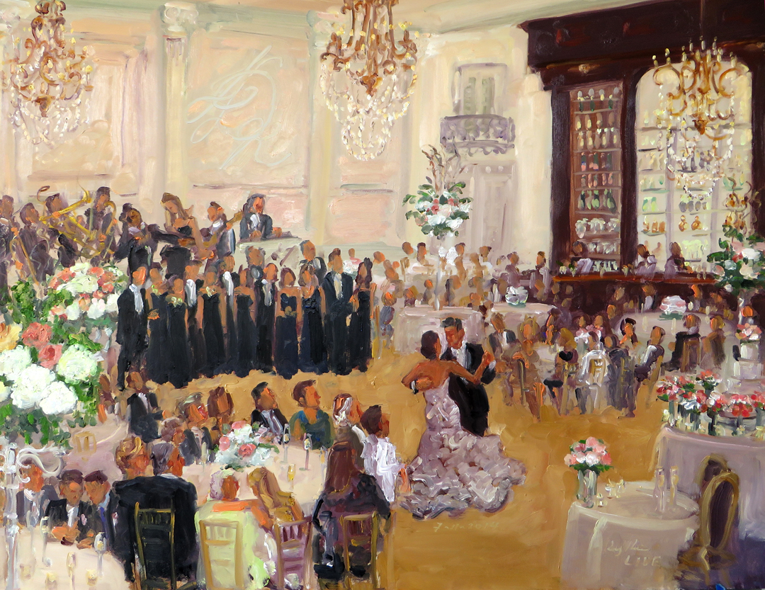 " Joan, You captured the magic of our daughter's wedding reception at the Cescaphe Ballroom in such an amazing painting. I had intended to give it as their wedding gift, but, after seeing the finished work, WE may hold on to it for a year to enjoy ourselves, then give it as an anniversary gift! Our guests so enjoyed watching your progress throughout the evening. It truly was one of the highlights of the evening for everyone and what a wonderful treasure for Julie and Ryan to remember their wedding day. I am so glad I "stumbled" onto your website. Thank you from the bottom of our hearts." ~ Pam and Steve Engle, Bride's parents.